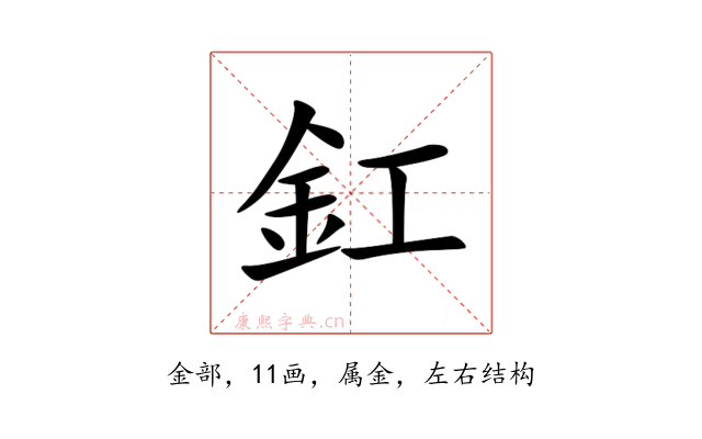〔釭〕字是左右结构,可拆字为“金、工”或“釒、工”。