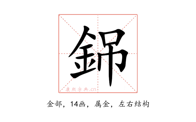 〔銱〕字是左右结构,可拆字为“金、吊”或“釒、吊”。