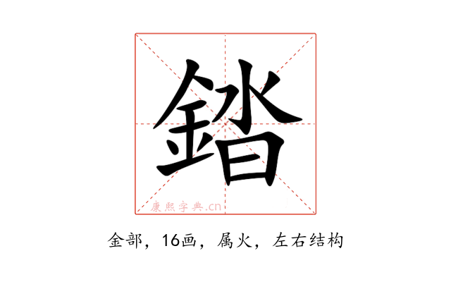 〔錔〕字是左右结构,可拆字为“金、沓”或“釒、沓”。