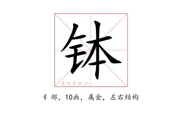 〔钵〕字是左右结构,可拆字为“钅、本”,五行属金。