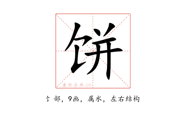 〔饼〕字是左右结构,可拆字为“饣、并”,五行属水。