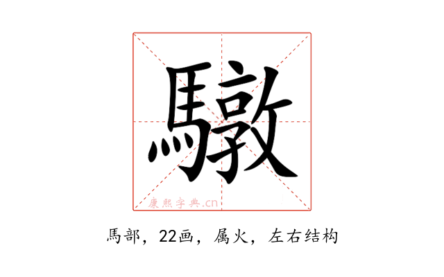 〔驐〕字是左右结构,可拆字为“馬、敦”。
