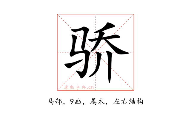 ◎(形声。从马,乔声。本义:六尺高的马) 同本义 a 6 feet horse骄,马高六尺为骄。《诗》曰:“我马唯骄。”——《说文》四牡有骄。——《诗·卫风·硕人》