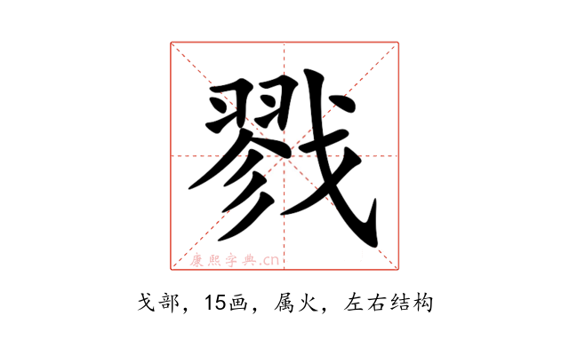 〔戮〕字是左右结构,可拆字为“翏、戈”,五行属火。